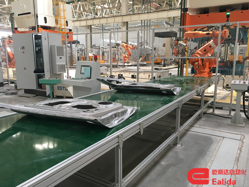 用于承接下料機器人或下料機械手放置的工件,并將工件及時的輸送到線尾。采用變頻電機驅動,設有自動、手動操作模式。 a、自動模式:零件的出料速度經過首次調節后,能存儲到相應的程序中,今后皮帶輸送機能根據零件的相應模具編號自動匹配出件速度,當出現異常情況時可以切換到手動模式。 ...